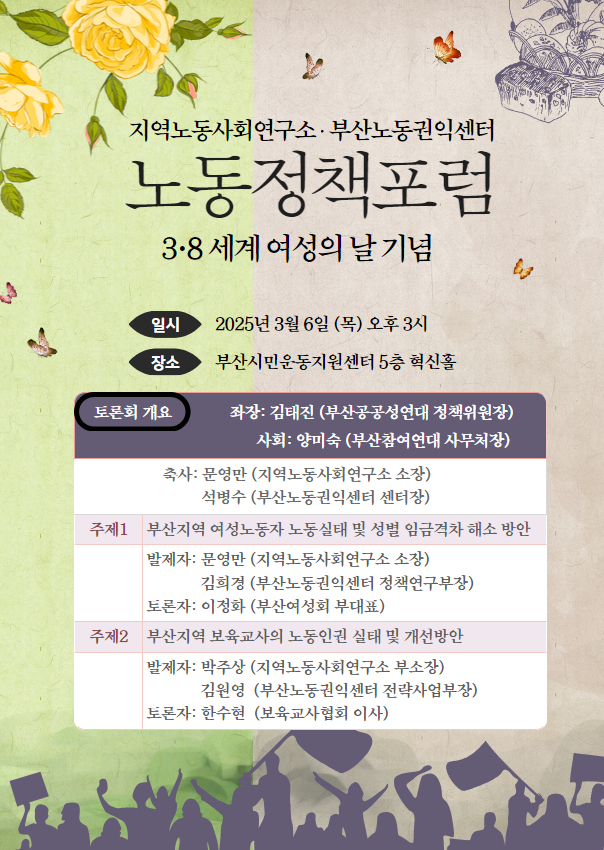 지역노동사회연구소와 부산노동권익센터가 3*8 세계 여성의 날 기념  [노동정책포럼]을 개최합니다.